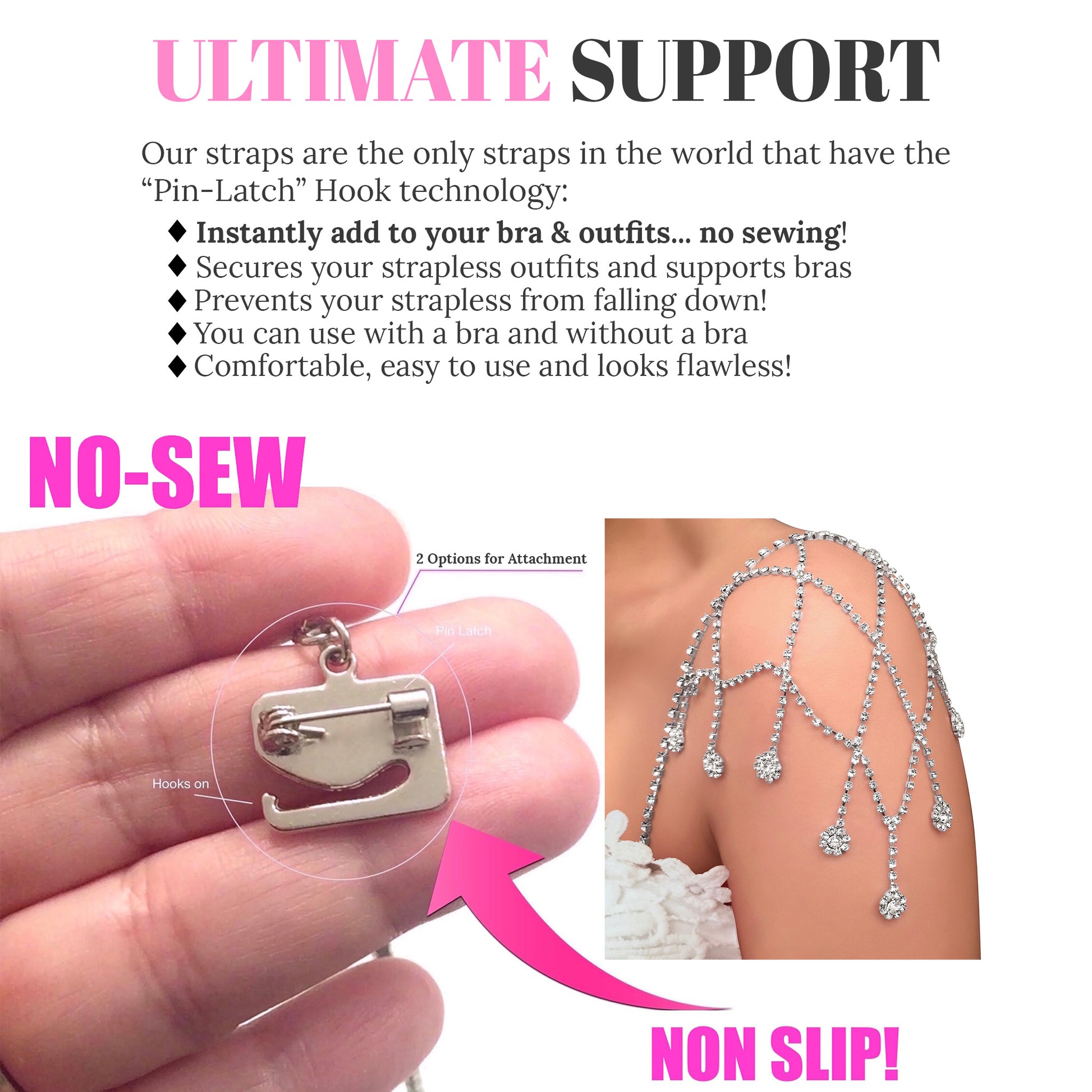 Unlike other straps, you can Hook On and Pin On instantly, discreetly, and securely to use with all your outfits without needing bra loops (no sewing), using our straps' one-of-a-kind "pin-latch" hooks.
