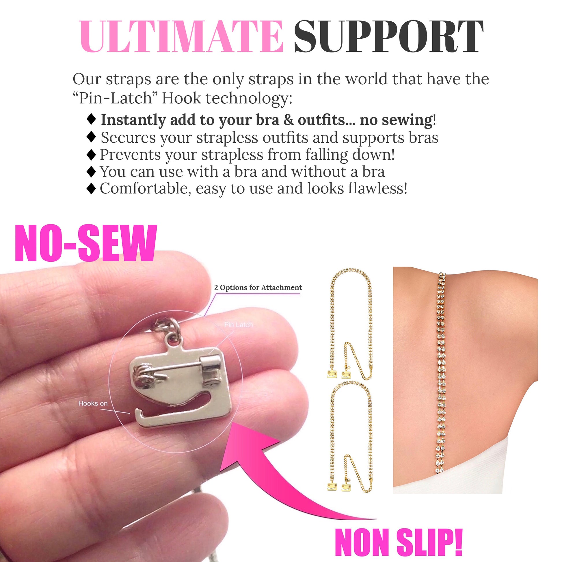 Unlike other straps, you can Hook On and Pin On instantly, discreetly, and securely to use with all your outfits without needing bra loops (no sewing), using our straps' one-of-a-kind "pin-latch" hooks.